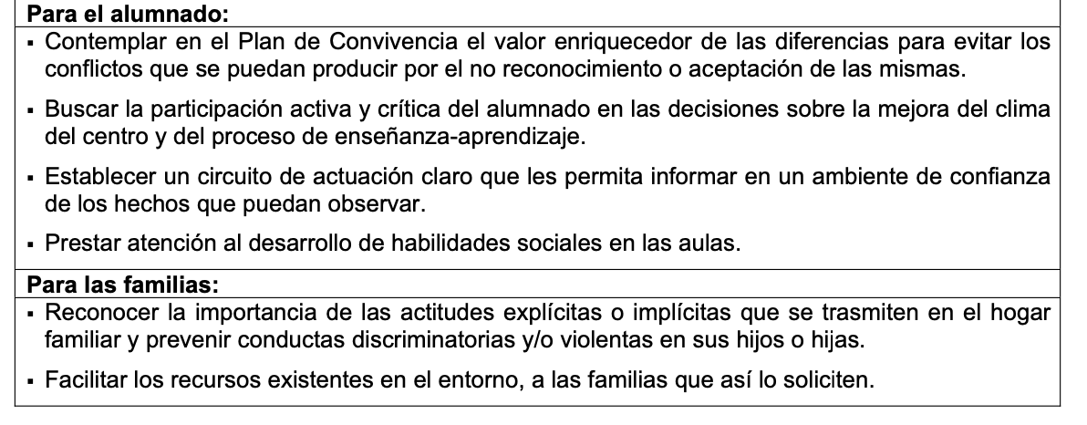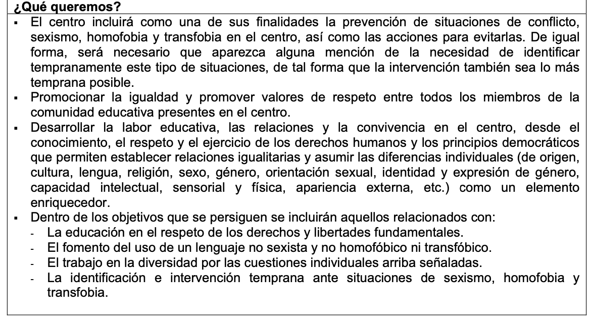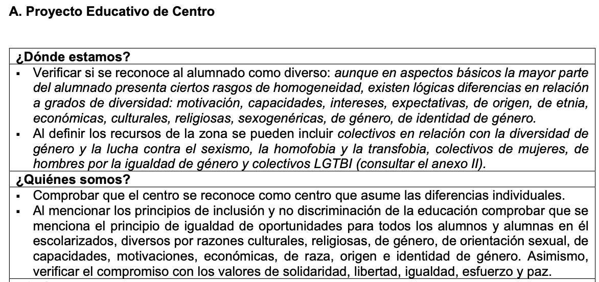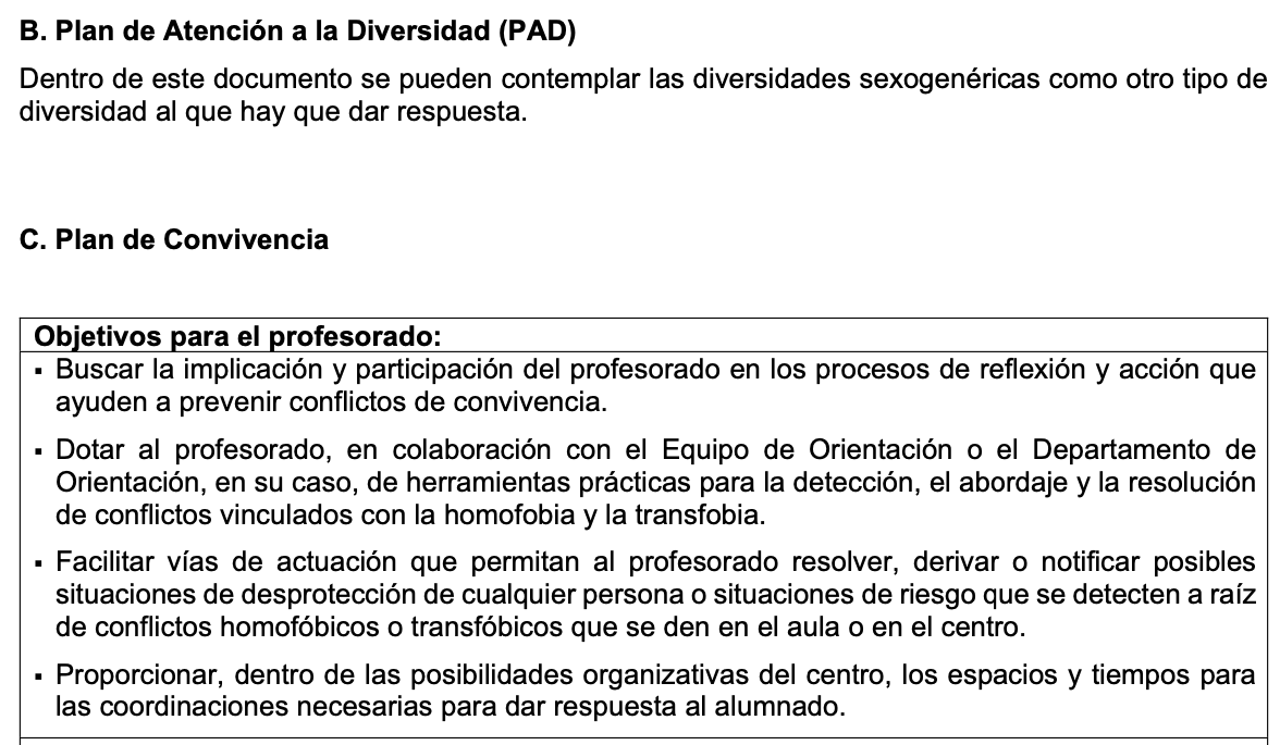 En las Instrucciones de las Viceconsejerías de política educativa y ciencia y organización educativa sobre los protocolos de intervención y atención educativa a la identidad de género en los centros docentes no universitarios de la Comunidad de Madrid, encontramos en sus anexos: definiciones y orientaciones para incluir esta necesaria labor en los documentos de centro: